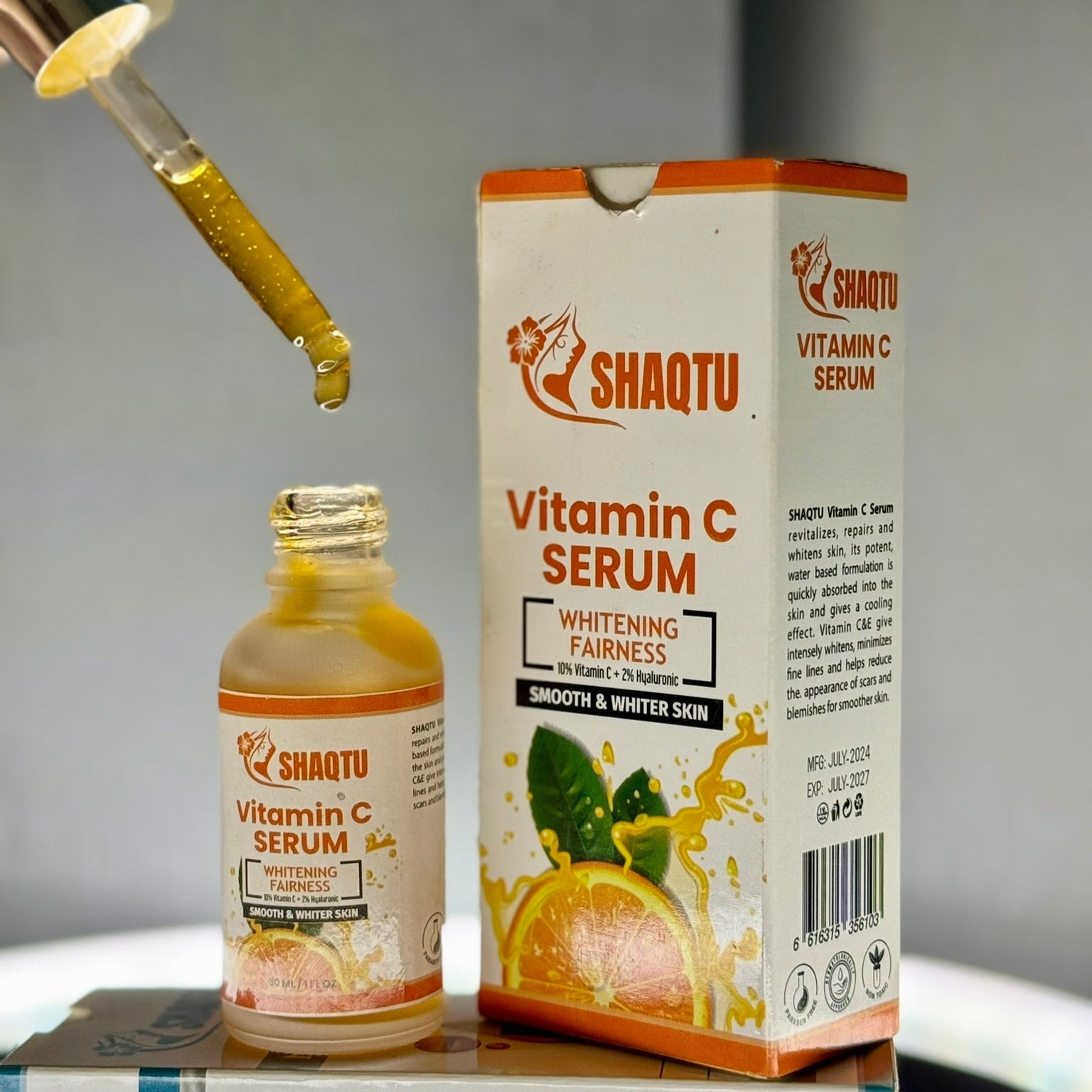 Unveil your skin’s natural radiance with Shaqtu’s advanced Vitamin C Serum — your daily dose of glow in a bottle. Powered by high-potency Vitamin C, this lightweight, fast-absorbing formula helps brighten dull skin, even out skin tone, and reduce the appearance of dark spots. Infused with hyaluronic acid for deep hydration and antioxidants to protect against environmental stressors, it works to leave your skin visibly smoother, firmer, and more luminous.